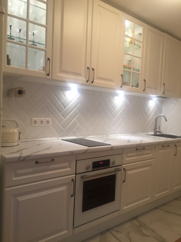 Когда производство кухни было завершено, нас ждало еще одно приятное знакомство. И здесь я хочу высказать еще одни слова благодарности бригаде Русака Дмитрия. Ребята настоящие мастера своего дела! Насколько слаженно и четко они работают. Особенно понравилось, что при спорных вопросах, ребята всегда советовали с нами. Во время установки было выявлено, что одна стена, к которой прилегает шкаф имеет ощутимо неровное покрытие, а в комплект со встроенными светилтниками не входила кнопка вкл/выкл. Ребята своими силами выравнили стену и сами принесли кнопку для светильников и решили все вопросы.