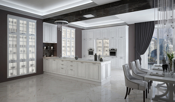 Для интеграции в помещения любых размеров подходят кухни неоклассика. В них сочетаются классические элементы и практичность модерна. При этом, выбирая версию для компактной комнаты, отдайте предпочтение с зеркальными и стеклянными вставками, открытыми навесными полками вместо верхних шкафов.